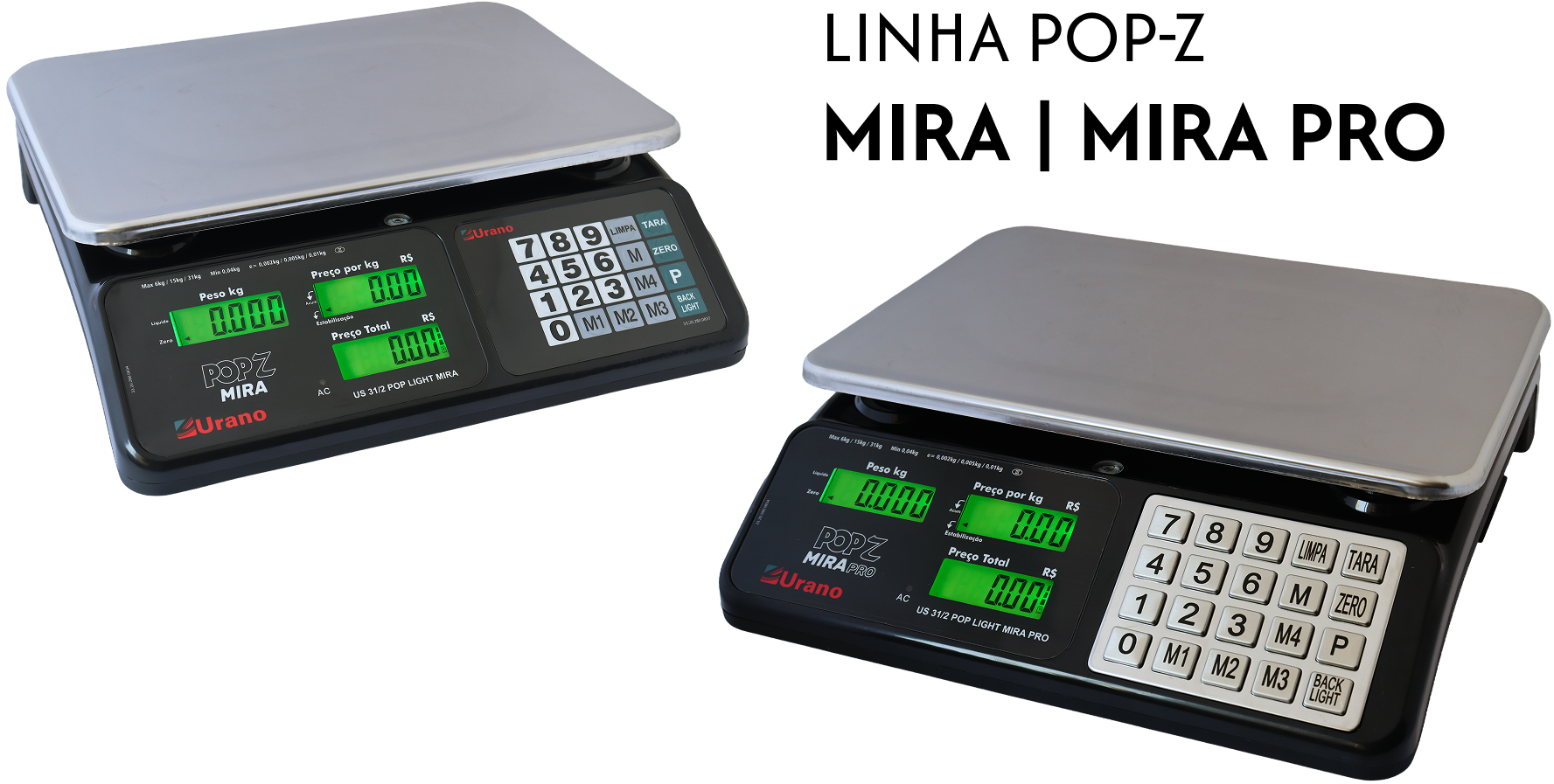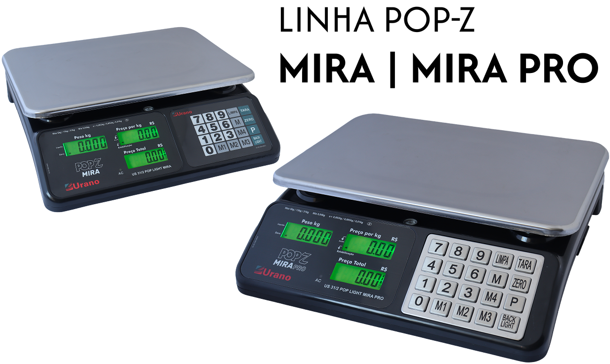 As balanças POP-Z Mira e POP-Z Mira Pro são compactas, modernas e oferecem capacidade de até 31 kg, com múltiplas faixas de pesagem, atendendo às necessidades do varejo e da indústria.