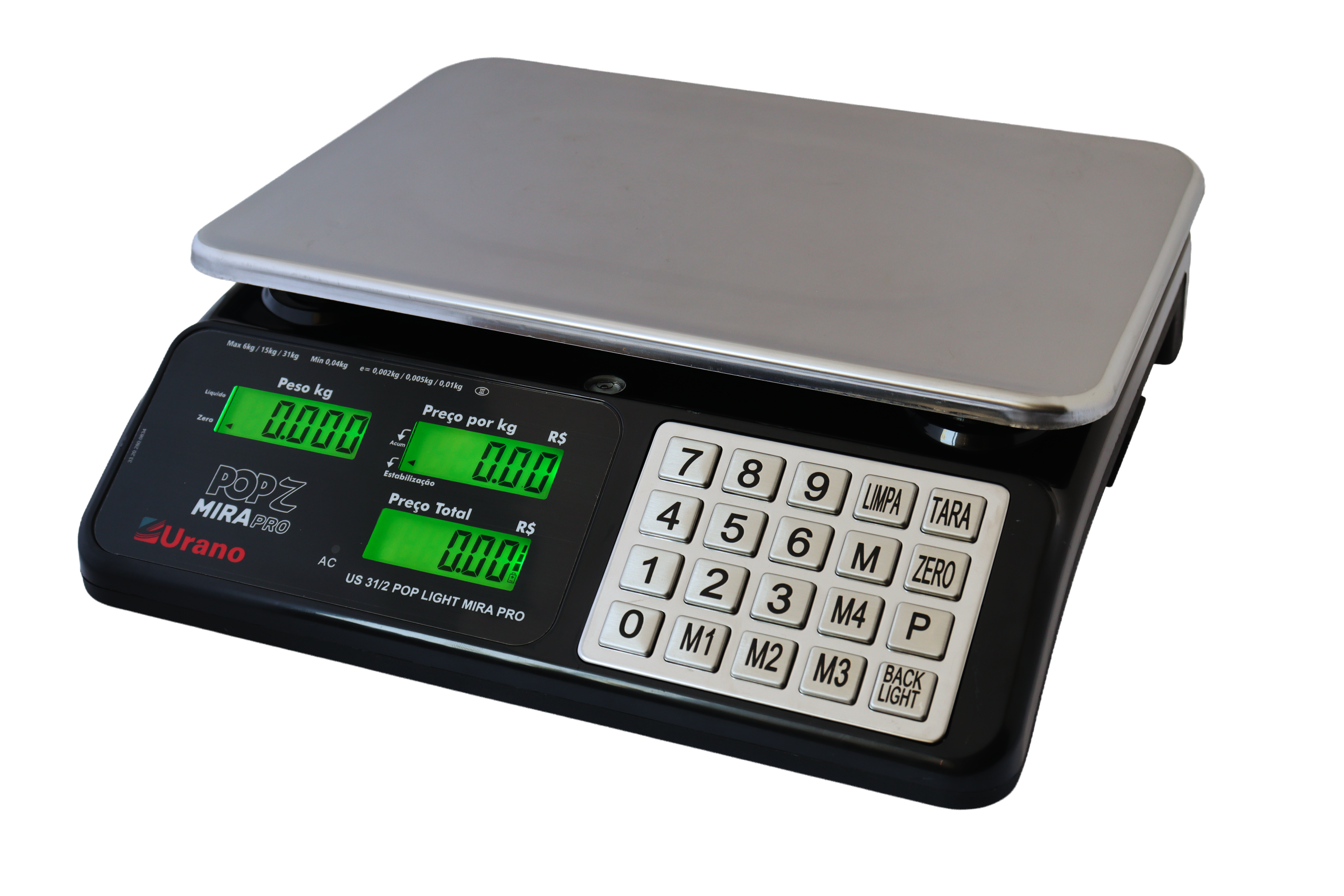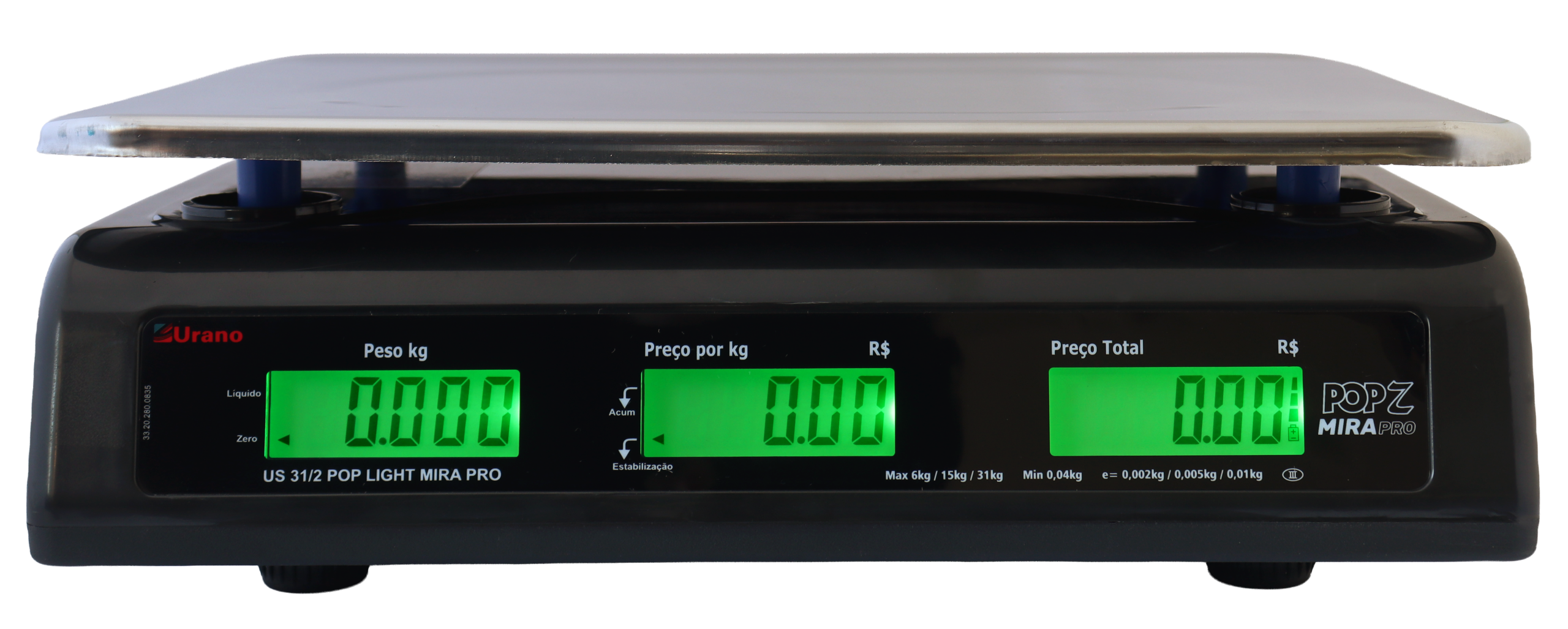 (0 a 6 kg, divisão de 2 g; 6,005 a 15 kg, divisão de 5 g e de 15,010 a 31 kg, divisao de 10 g).